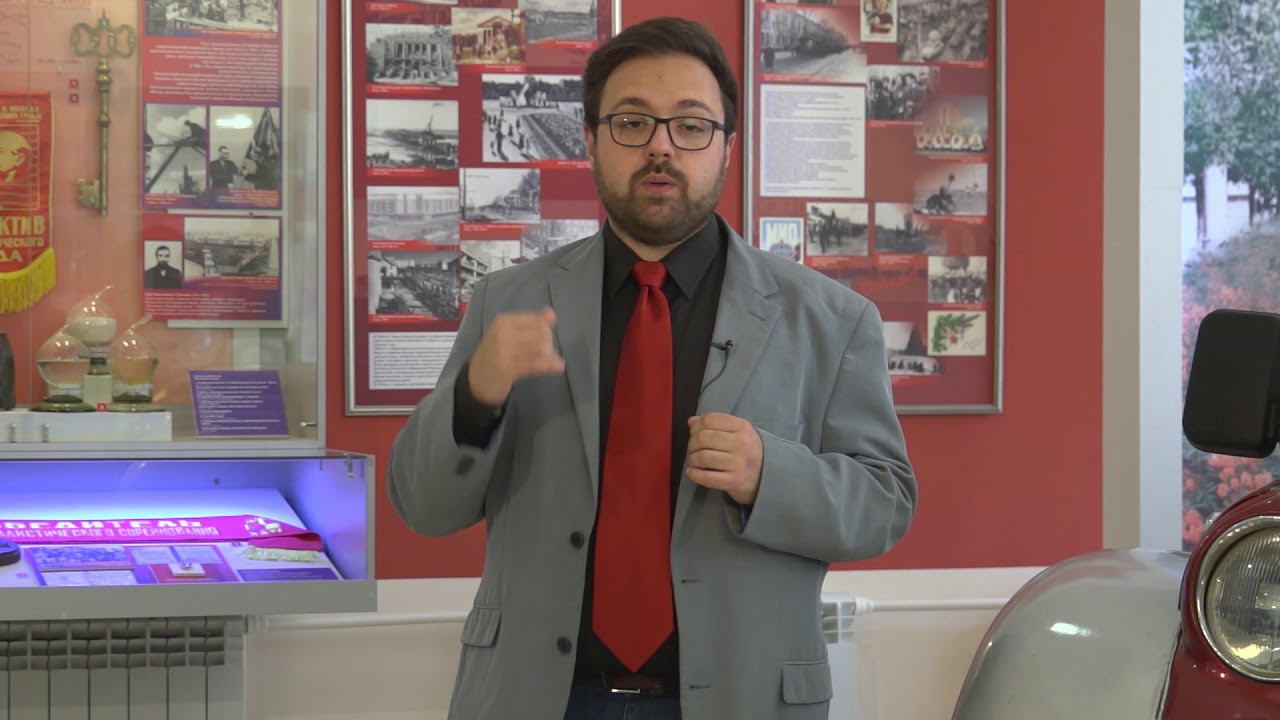 La fabbrica petrolchimica di Omsk. Vetrina dedicata alla fabbrica petrolchimica della città siberiana di Omsk. Italiani in Siberia. Museo di storia regionale di Omsk. Con Jacopo Vigna-Taglianti, lettore di lingue straniere presso il Centro Linguistico dell’Università statale agraria di Omsk.