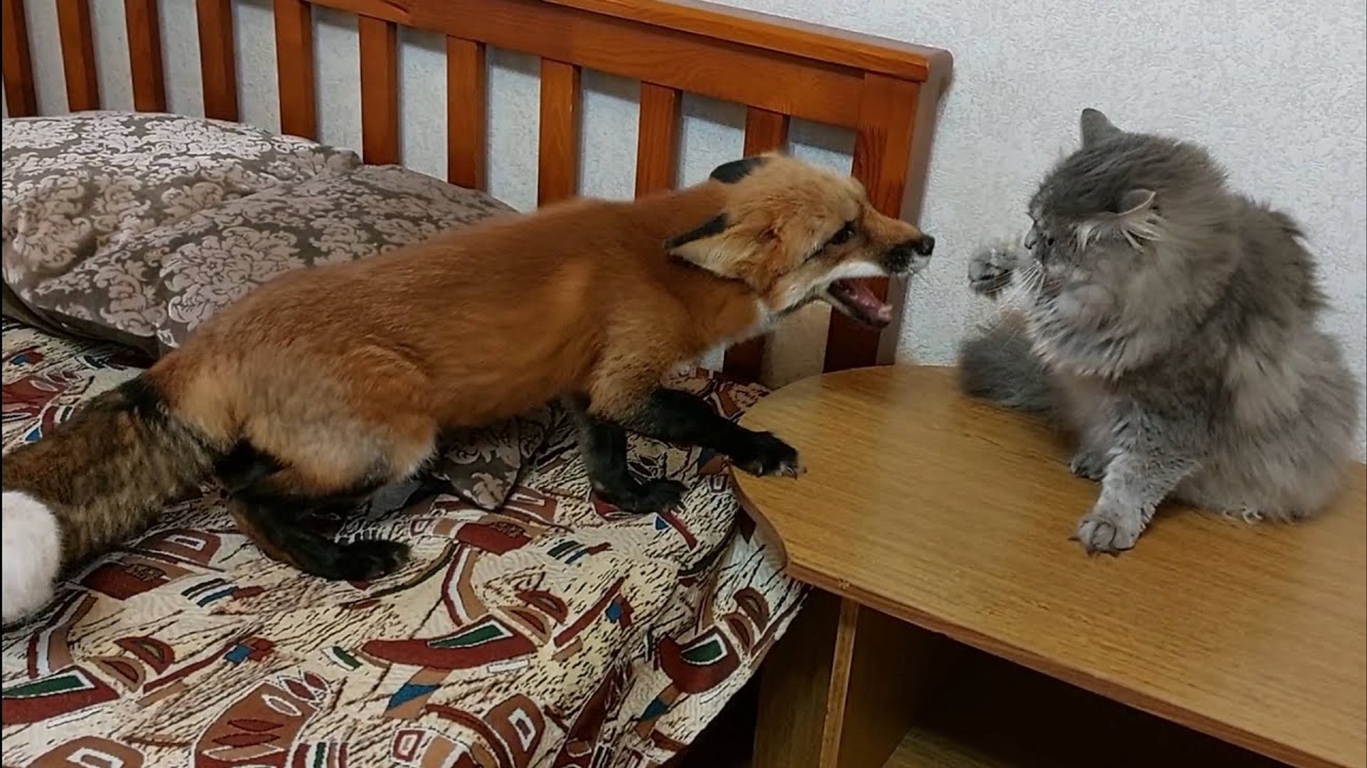 Лис радуется встрече с котом