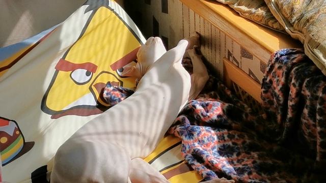 Кот породы "сфинкс" греется на солнышке