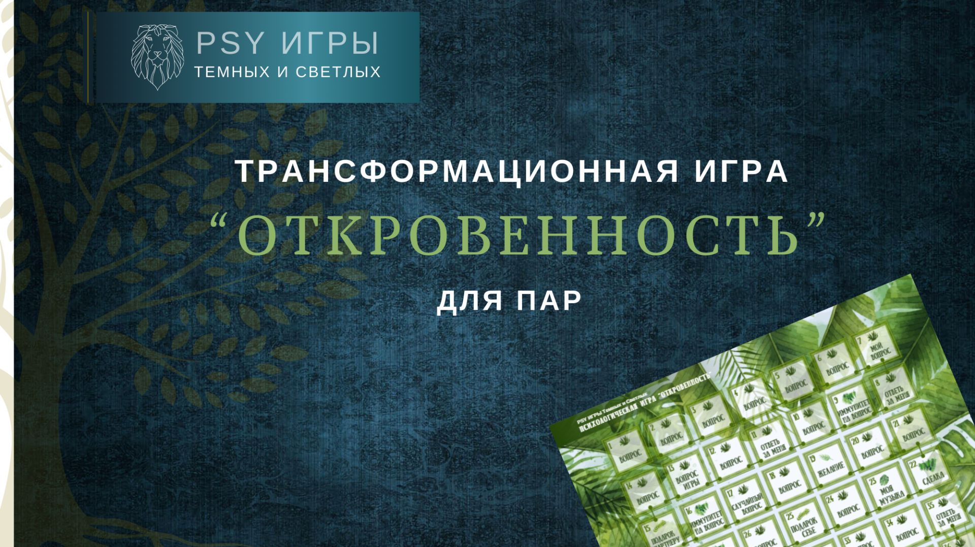Трансформационная психологическая игра от PSY ИГРЫ Темных и Светлых "Откровенность" - это уникальная техника работы с отношениями, когда есть желание узнать друг друга глубже, проиграть некоторые острые моменты, такие как отказы, сопротивление, договоренности. Другие игры можно найти на сайте люди-с.рф