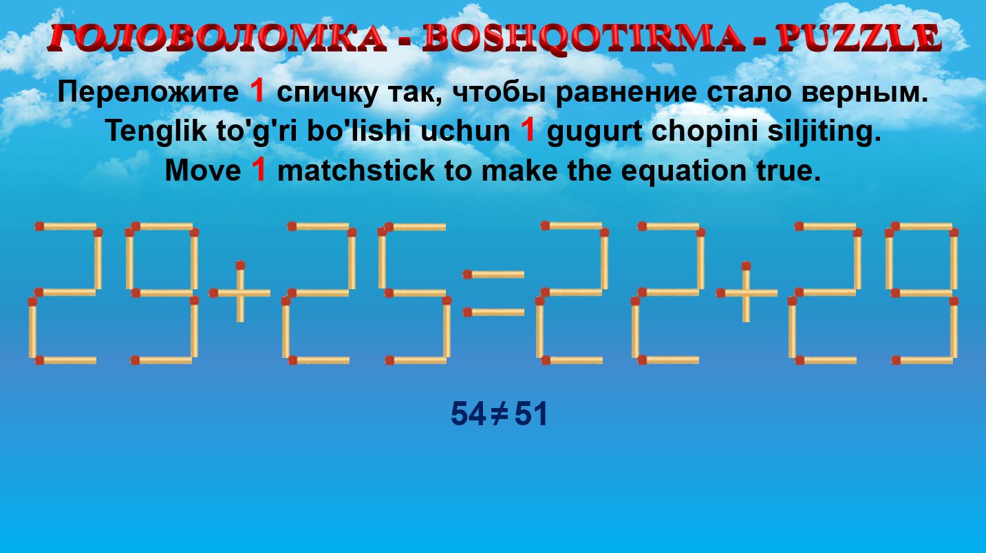 ГОЛОВОЛОМКА - BOSHQOTIRMA – PUZZLE. Спичка. 29+25=22+29, 28+29=29+25, 29+39=30+33, 24+36=39+30