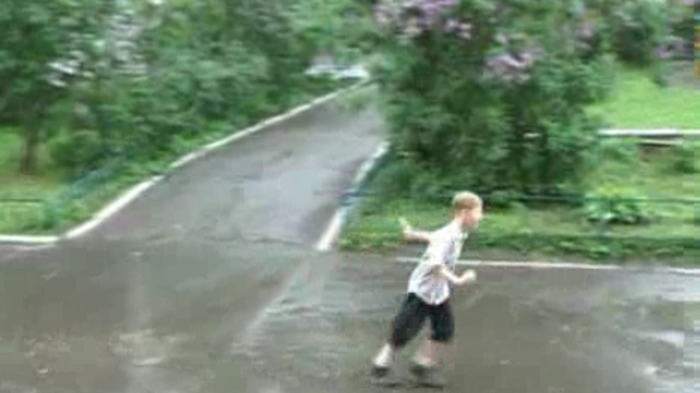 Дети гуляют под дождём. Звучит ненавязчивая джазовая мелодия.