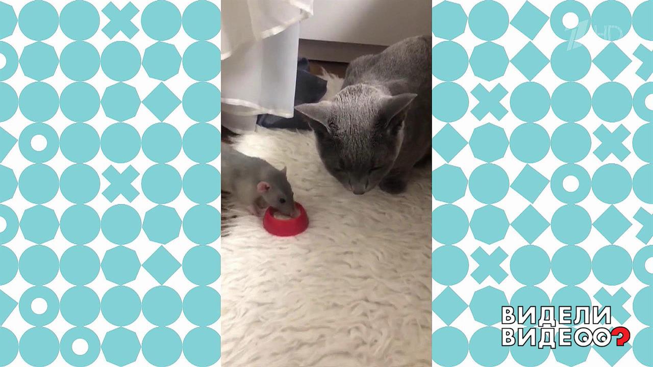 Крыса по имени Мася отнимает еду у кошки Дуняши.