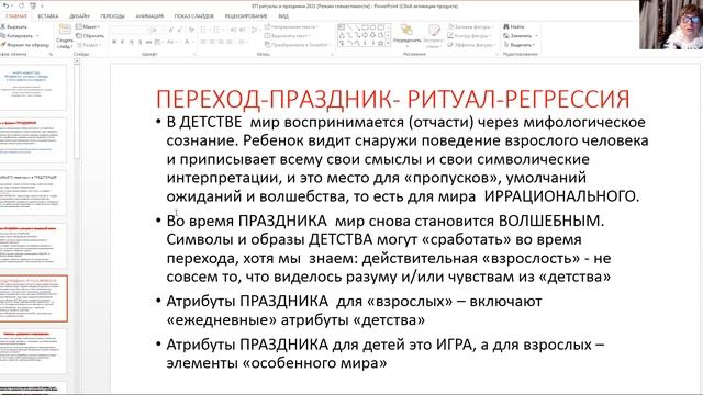 Праздники! Можно ли к этой теме подойти с позиции НАУЧНОЙ ПСИХОЛОГИИ? ПРАЗДНИК ЭТО КУЛЬТУРНАЯ ФОРМА УПРАВЛЯЕМОГО КРИЗИСА. это способ деконструировать накопившиеся изменения и "не стыковки" и дать месо для формирования НОВОГО ОПЫТА. ритуал это форма бытия в событии, которое называется "праздник". с точки зрения концепции "изменения происходят в пространстве отношений" праздник это уникальная и адекватная форма для сопровождения изменений. Праздник это ОБЩНОСТЬ людей между собой и уровней БЫТИЯ в мире. формы и виды ПРАЗДНИКОВ: Ежегодные (календарные) общие для группы («Новый Год») Персональные календарные («день рождения», день свадьбы») Уникальные для человека и группы (свадьба, рождение ребенка, удачное приобретение, переезд и другие изменения статуса) Плановые события для изменения статуса, инициация (защита диссертации, поход в школу, выпускной…) Праздник это культурно приемлемая форма управляемого КРИЗИСА для человека и/или группы. Из БЫВШЕГО переходим в ПРЕДСТОЯЩЕЕ "Переход" означает: старое осталось позади, новое наступает. "Переход" люди отмечают ПРАЗДНИКАМИ. Во время ПРАЗДНИКА люди всегда «немного как дети». И даже можно реализовать свои ожидания, активные в детстве. Во время ПРАЗДНИКА человек или группа вступают в «особенное время», во время которого действуют по известным им готовым или импровизированным ритуалам Праздник это что-то ОСОБЕННОЕ. Как может быть ПРАЗДНИК без РИТУАЛА? ПРАЗДНИК и ритуал создает эпизод упорядоченности пространства и времени. Ритуал создает (предсказуемые и узнаваемые) форматы и «рамки», в которых может быть размещена эмоциональная энергия человека и избежать тревоги ПРАЗДНИК и ритуал помогают организовать СОБЫТИЕ в отношениях между людьми. Ритуал создает привычки, (вредные или полезные) для социальной, эмоциональной и физической жизни человека. праздник это время, когда люди становятся "как дети". Во время ПРАЗДНИКА мир снова становится ВОЛШЕБНЫМ. Символы и образы ДЕТСТВА могут «сработать» во время перехода, хотя мы знаем: действительная «взрослость» - не совсем то, что виделось разуму и/или чувствам из «детства» Атрибуты ПРАЗДНИКА для «взрослых» – включают «ежедневные» атрибуты «детства». Атрибуты ПРАЗДНИКА для детей это ИГРА, а для взрослых – элементы «особенного мира». Человек имеет опыт выхода, пребывания и входа в новый мир В промежутке между «входом» и «выходом» мы обнаруживаем особенное пространство-время Символически этот эпизод не принадлежит «обыкновенному» миру. В этом интервале пространства-времени человек находится в измененном состоянии