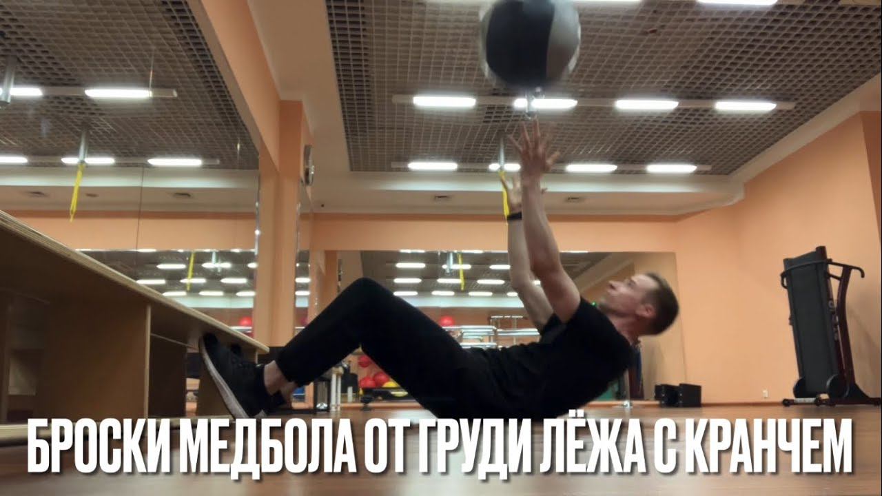 Броски медбола от груди лёжа со сгибанием грудного отдела