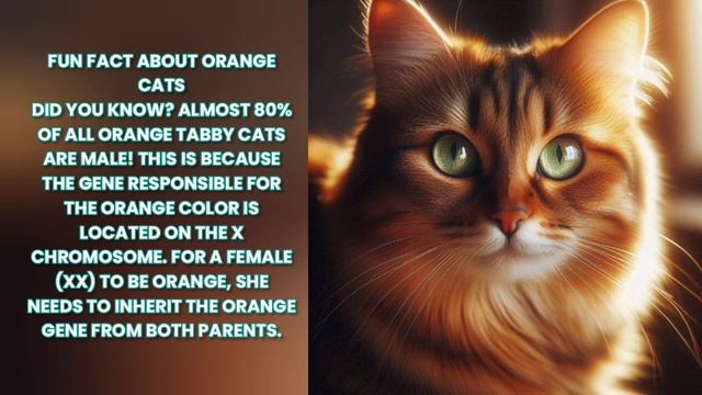 🍊 Весёлый Факт о Рыжих Котах Знаете ли вы? Почти 80% всех рыжих котов — самцы! Это связано с тем, что ген, отвечающий за рыжий окрас, находится на X-хромосоме. Чтобы самка была рыжей (XX), ей нужно унаследовать рыжий ген от обоих родителей Fun Fact About Orange Cats Did you know? Almost 80% of all orange tabby cats are male! This is because the gene responsible for the orange color is located on the X chromosome. For a female (XX) to be orange, she needs to inherit the orange gene from both parents.