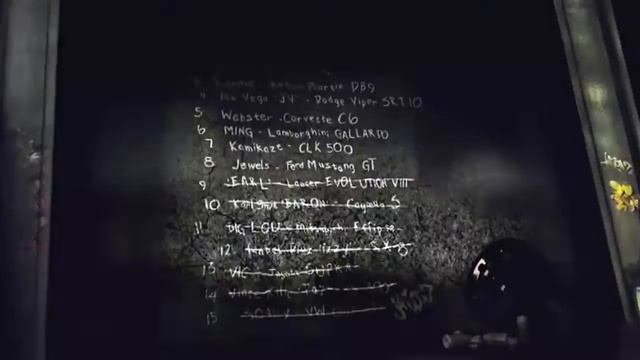 таймкоды 0:00 Blacklist #15 : Ho Seun AKA. Sonny 「 Volkswagen Golf GTI 」 0:49 Blacklist #14 : Vince Kilic AKA. Taz「 Lexus IS 300 」 1:40 Blacklist #13 : Victor Vasquez AKA. Vic 「 Toyota Supra 」 2:40 Blacklist #12 : Isabel Diaz AKA. Izzy 「 Mazda RX-8 」 3:42 Blacklist #11 : Lou Park AKA. Big Lou「 Mitsubishi Eclipse GT 」 4:36 Blacklist #10 : Karl Smit AKA. Baron「 Porsche Cayman S 」 5:38 Blacklist #9 : Eugene James AKA. Earl 「 Mitsubishi Lancer Evolution VIII 」 6:29 Blacklist #8 : Jade Barrett AKA. Jewels「 Ford Mustang GT 」 7:17 Blacklist #7 : Kira Nakazato AKA. Kaze 「 Mercedes-Benz CLK 500 」 8:19 Blacklist #6 : Hector Domingo AKA. Ming「 Lamborghini Gallardo 」 9:34 Blacklist #5 : Wes Allen AKA. Webster 「 Chevrolet Corvette C6 」 10:30 Blacklist #4 : Joe Vega AKA. JV「 Dodge Viper SRT-10 」 11:23 Blacklist #3 : Ronald McCrea AKA. Ronnie「 Aston Martin DB9 」 12:28 Blacklist #2 : Toru Sato AKA. Bull「 Mercedes-Benz SLR McLaren 」 13:23 Blacklist #1 : Clarence Callahan AKA. Razor「 BMW M3 GTR 」