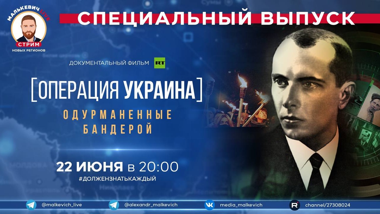 В рамках спецрубрики #ДолженЗнатьКаждый мы покажем документальный фильм «Операция Украина. Одурманенные Бандерой», созданный журналистами документального телеканала RTД. (https://t.me/rtdru) Националистические отряды на территории УССР действовали во время и после Великой Отечественной войны. Поддерживаемые сначала вермахтом, а затем ЦРУ, они боролись с советской властью, уничтожая мирное население. В народе их называли бандеровцами — по имени одного из лидеров, Степана Бандеры. Сегодня украинские националисты переняли как идеологию, так и методы своих предшественников, устраивая массовые убийства и кровавый террор. Авторы фильма встретились с последним из живых свидетелей расстрела в Бабьем Яре, где бандеровцы убивали людей наряду с немецкими оккупантами, и с жителем Донбасса, который прошёл через пытки в лагере боевиков ультраправой организации «Правый сектор» (украинское объединение радикальных националистических организаций, признанное экстремистским и запрещённое на территории России) в 2014 году. Военные эксперты, историки и журналисты рассказали, как возрождалась идеология нацизма на современной Украине, кто сделал Бандеру и его приспешников национальными героями и почему Запад поддерживает и поощряет современных националистов. Смотрите документальный фильм «Операция Украина. Одурманенные Бандерой» ? Внимательного вам просмотра @malkevich_live