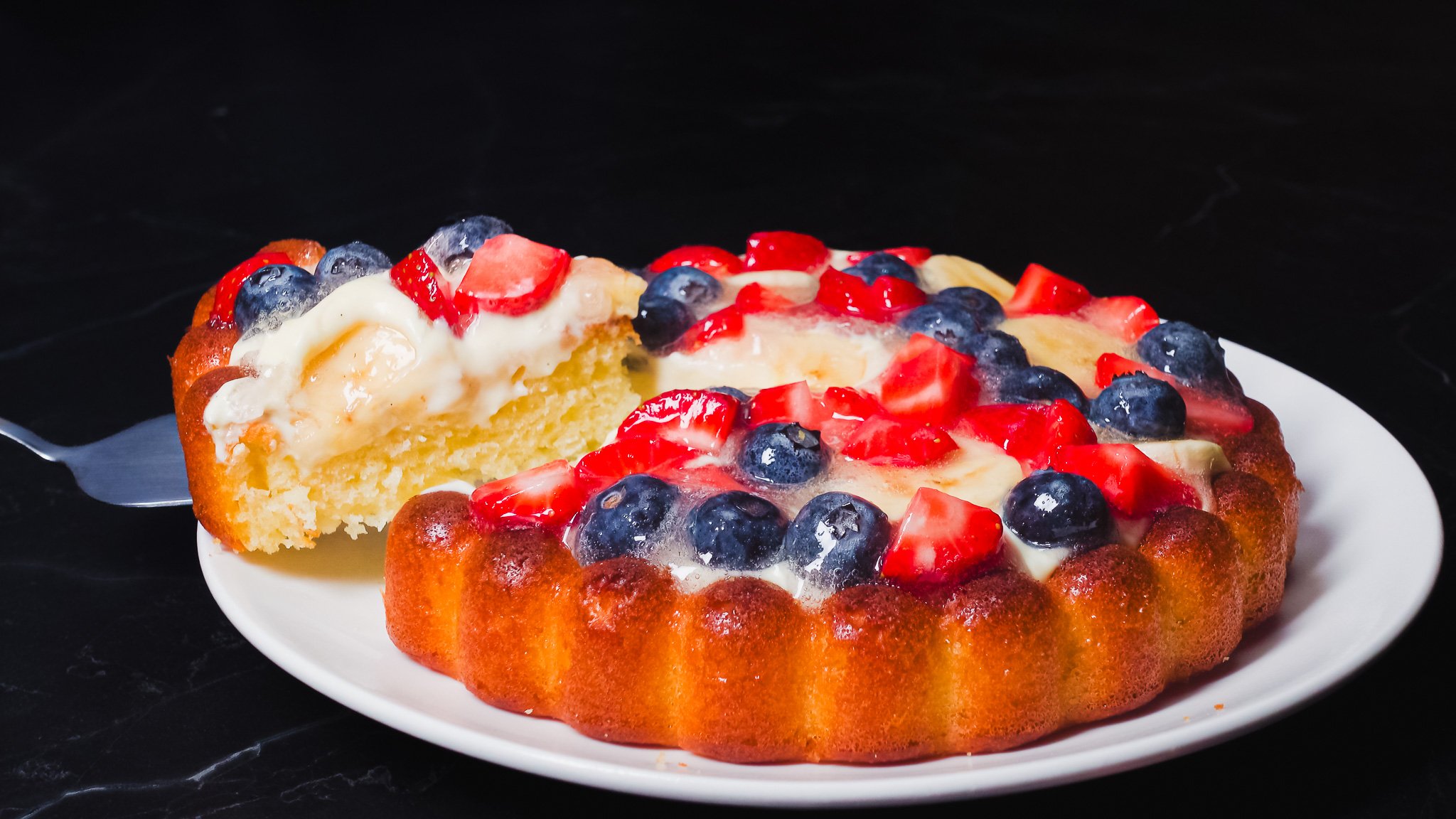 Как приготовить “Тирольский пирог” Ингредиенты на форму 18 см: Бисквит Яйца 1 шт Сгущенное молоко 110 г Ванильный экстракт 1 ч.л. Растительное масло 60 г Сметана 120 г (любой жирности) Мука пшеничная 110 г Разрыхлитель 3 г Заварной крем Желток 1 шт Сахар 17 г Кукурузный крахмал 5 г Молоко 100 г Ванильный экстракт 1 ч.л. Сливки 30% и выше 85 г Сахар 10 г Желейная глазурь Сахар 40 г Вода 40 г Желатин 2 г