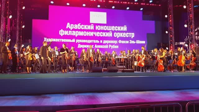 Чествование публики АРАБСКОГО ЮНОШЕСКОГО ФИЛАРМОНИЧЕСКОГО ОРКЕСТРА после выступления