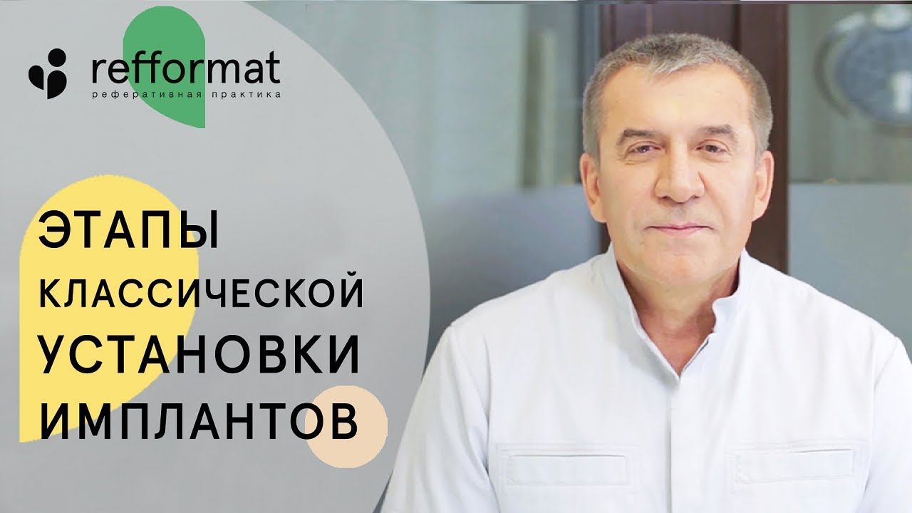 Классическая имплантация зубов - один из самых проверенных и изученных методов восстановления зубного ряда. ▶ http://bit.ly/2EhfT11 ◀ В клинике Refformat представлены все виды имплантации зубов. Мы поможем выбрать Вам самый подходящий и надежный метод протезирования. Переходите по ссылке выше, чтобы узнать подробности и записаться на прием. Как не ошибиться при выборе зубных имплантатов? https://www.youtube.com/watch?v=RZ2N5D14DN4 Полная имплантация на беззубую челюсть за 1 день: https://www.youtube.com/watch?v=HQZXLhZEo3c Про метод двухэтапной имплантации зубов: https://youtu.be/KE2kKVEoDpM Не пропустите новые видео о классической и других видах имплантации зубов - Подпишитесь на канал стоматологии Refformat по ссылке https://goo.gl/Uk9VYj Нажмите на цифры для навигации по времени ролика. 0:00 → Мы раскрываем, ставим формирователь, и через 2 недели мы снимаем слепки для установки конструкции . Просверливаем ложе для имплантата, вкручиваем и ушиваем – на этом заканчивается двухэтапная установка имплантата. Здравствуйте. В этом видео вы узнаете о самом хорошо изученном методе имплантации. Досмотрите ролики до конца, и информация вам пригодится. Моя сегодняшняя задача рассказать вам о классической установке имплантатов, двухэтапной, с отсроченной нагрузкой. Эта имплантация существует уже довольно-таки давно, классическая, как мы раньше ставили и сегодня ставим так имплантаты. Перед тем, как заняться имплантацией, мы должны провести клинико-рентгенологические обследования – оценить состояние костей, оценить состояние организма, готов ли он воспринять имплантат, и уточнить все преимущества и недостатки окружающих тканей, в которые мы будем ставить имплантаты. Классическая имплантация зубов. 1:27 → После этого мы назначаем пациенту время, когда нужно прийти на операцию, под местной анестезией мы разрезаем слизисто-надкостничный лоскут, отслаиваем его, смотрим на наличие кости. Если там идеальное количество кости, мы рассверливаем ложе под имплантат и вкручиваем имплантат – это занимает максимум 5-7 минут. Если мы определяем, что недостаток костной ткани у нас существует, она тонкая или по горизонтали низкая, мы планируем пациента на костную пластику. Костная пластика состоит из того, что мы или берём аутокость у пациента и подсаживаем её в недостающий участок, или мы используем аллопластические всевозможные материалы, которые устраняют этот дефект, и ушиваем слизисто-надкостничный лоскут. Имплантация зубов. 2:30→ Мы выдерживаем это 3-4 месяца, после этого пациент приходит к нам, мы разрезаем снова слизисто-надкостничный лоскут, отслаиваем, смотрим, что у нас достаточное количество кости, рассверливаем ложе для имплантата, вкручиваем и ушиваем. Выдерживаем 3-6 месяцев зависимости от того, верхняя это или нижняя челюсть, т.к. на верхней мы выдерживаем дольше, там более порозная кость, бывает, что мы упираемся в гайморову пазуху, и поэтому мы выдерживаем 6 месяцев; нижнюю челюсть выдерживаем 3 месяца. После этого мы раскрываем, ставим формирователь, и через 2 недели мы снимаем слепки для установки конструкции. На этом заканчивается двухэтапная установка имплантатов. Имплантация зубов. 3:34 → Этот метод довольно-таки классический и старый, но он не всегда удобен для пациентов, потому что нужно долго ждать до того, как вы поставите коронку. Эту методику или другую методику должен определить ваш лечащий врач, кото