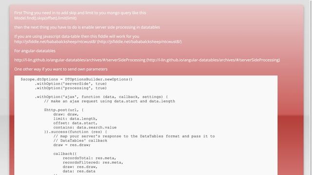 node.js: How to implement server side rendering datatable, Using node and mongo db? Thanks for taking the time to learn more. In this video I'll go through your question, provide various answers & hopefully this will lead to your solution! Remember to always stay just a little bit crazy like me, and get through to the end resolution. Don't forget at any stage just hit pause on the video if the question & answers are going too fast. Content (except music & images) licensed under CC BY-SA meta.stackexchange.com/help/licensing Just wanted to thank those users featured in this video: Mahesh Gareja (https://stackoverflow.com/users/5514439/mahesh-gareja guymaor86 (https://stackoverflow.com/users/4605972/guymaor86 Asif Saeed (https://stackoverflow.com/users/4440905/asif-saeed Vipul Pandey (https://stackoverflow.com/users/5881773/vipul-pandey Trademarks are property of their respective owners. Disclaimer: All information is provided "AS IS" without warranty of any kind. You are responsible for your own actions. Please contact me if anything is amiss. I hope you have a wonderful day. Related to: node.js, mongodb, datatable