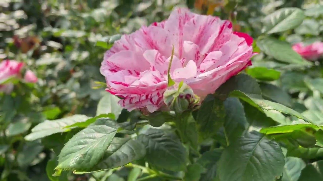 Обзор розы флорибунда `Сентиментал`. Цветки полосатые: красные и бело-кремовые, больше белого, чем красного, чашевидные, крупные, 10-12 см в диаметре, махровые, 25-30 лепестков, в небольших соцветиях. Аромат сильный. Листья крупные, полублестящие, кожистые. Шипы умеренные. Кусты компактные, прямые, до 1 м высотой. Цветение обильное. Имеет высокую устойчивость к болезням. Снято в питомнике растений "Ёлы-палы"