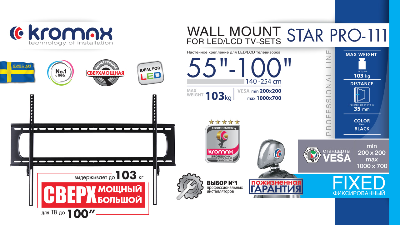KROMAX STAR PRO-111 BLACK надёжно удержит экран размером 55"-100" дюйма и весом 103 кг. Простая и интуитивно понятная конструкция KROMAX STAR PRO-111 BLACK идеально подойдет для самостоятельного монтажа. Кронштейн подходит для большинства телевизоров популярных брендов, среди которых Samsung, LG, Sony, Panasonic, Sharp, Toshiba, KIVI, Xiaomi Mi, SUPRA, Hyundai, Erisson, Tcl, Asano, Horizont, JVC, Thomson, HARTENS, Skyworth, HAIER, BBK, AVEL, Витязь, Веко, BQ, DEXP, OZON, SkyLine, Pioneer, Philips, Rolsen, Harper, Hisense, Hitachi, Polarline, Prestigio и других. Крепёжные отверстия KROMAX STAR PRO-111 BLACK изготовлены по международному универсальному стандарту VESA. В комплектацию KROMAX STAR PRO-111 BLACK входят необходимые для монтажа материалы. Вся продукция обеспечивается гарантийными обязательствами. Пожизненная гарантия на все сварные и механические соединения позволит наслаждаться конструкцией долгий срок. Во время эксплуатации KROMAX STAR PRO-111 BLACK демонстрирует поразительную износостойкость и безотказность. Подробнее https://www.kromax.ru/produce/fixed_frame/4861/