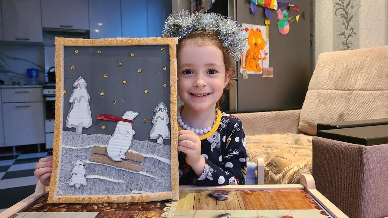 Зимняя поделка с Супер Розой Зимняя картина белый медведь на лыжах. Супер Роза закрашивает фон картон серым цветом, красит заготовки ёлки, лыжи, медведя белой краской, обводит их серой краской. Белую салфетку (снег) клеит на нижней части фона клеем карандаш. Распределяет заготовки на фоне согласно композиции. Красит рамку золотой гуашью. #творчество #новыйгод #новогодняяподелка #поделки #своимируками #белыймишка #подарокбабушке
