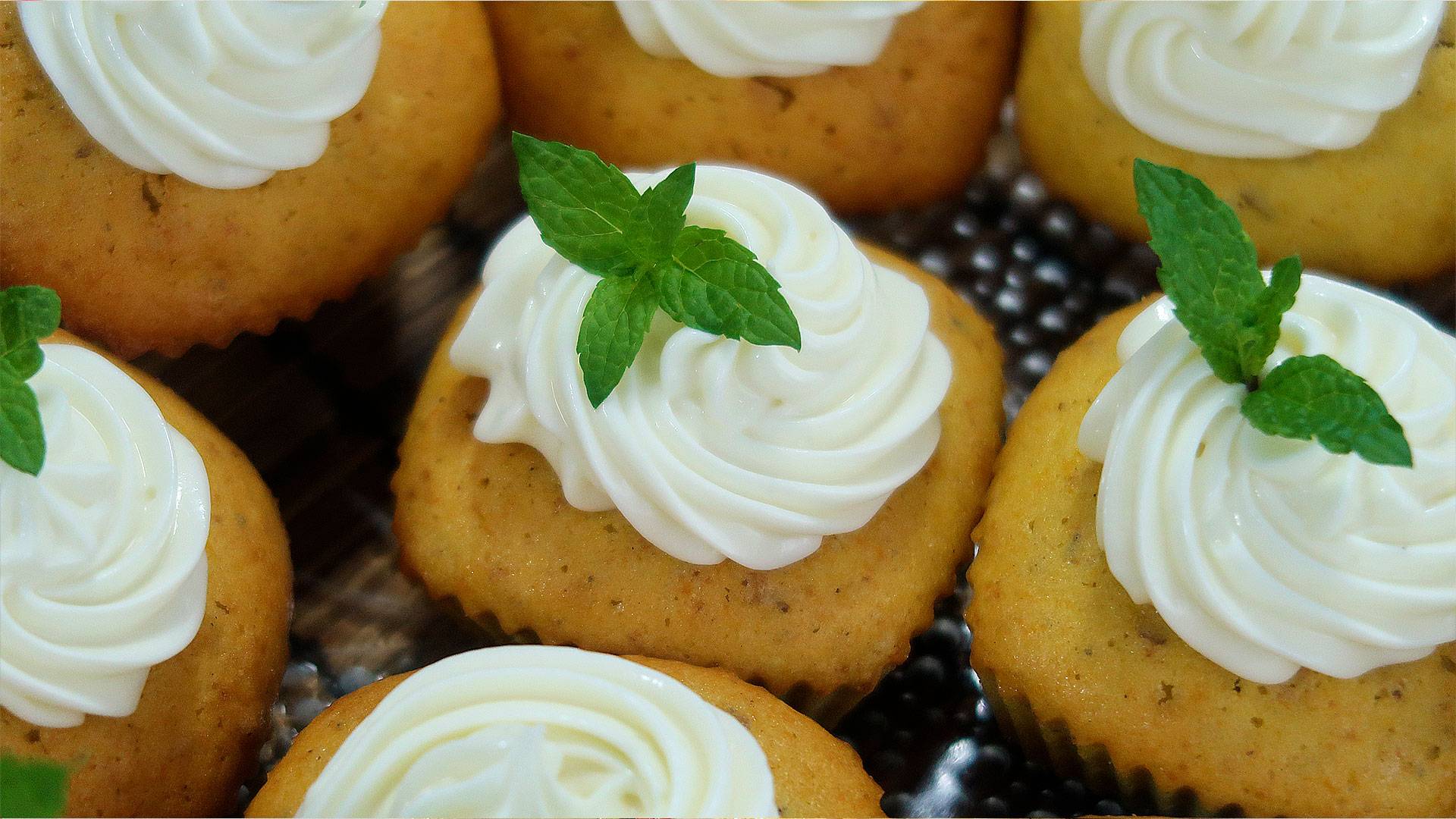 Сегодня испечем легкие, воздушные тыквенные кексы с грецким орехом и сливочным кремом. А еще они получаются красивого золотисто-оранжевого цвета. Для теста: Тыква (вес мякоти) - 300 г Мука - 225 г Яйца - 3 шт Сахар - 190 г Растительное масло без запаха - 140 мл Грецкие орехи - 50 г Разрыхлитель - 1 ч.л Соль - щепотка Молотая корица - 1\2 ч.л Молотый мускатный орех - щепотка Для сливочного крема: Сливочный творожный сыр - 100 г Сахарная пудра - 80 г Для украшения: Листики мяты