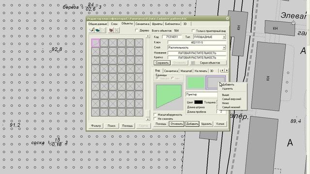 Выполняется редактирование классификатора на примере создания нового условного знака. Объект "Растительность луговая" сочетает в себе три условных знака - полигон цветное стекло, пунктирную границу и полигон заполненный знаками