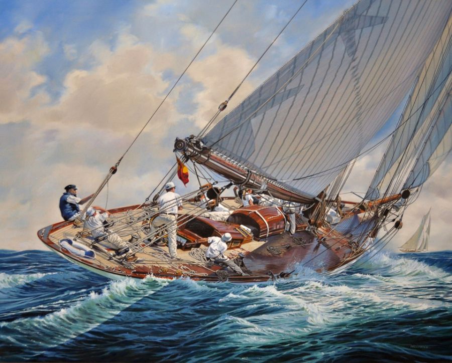 Расс Крамер (Russ Kramer) – уже в 15 лет знал, что родился морским художником. Но ему потребовались целых 25 лет, чтобы это произошло. В 1980-х Расс работал в газетах: художником, художественным руководителем, главным редактором и консультантом по дизайну. Прежде, чем стать живописцем, Расс провёл много лет в творческом предпринимательстве, рисуя рекламу и редакционные иллюстрации, журнальные и газетные макеты, участвуя в рекламных кампаниях для телевидения. Большую часть своего времени Расс жил на борту своей рыболовно-спортивной яхты с названием “Watercolor”, что означает "Акварель", и задавался вопросом, почему он до сих пор ещё не художник. “До подросткового возраста я рос на Лонг-Айленде, затем в Тампа-Бэй”, - говорит Расс. “Я помню плавание под парусом в летнем лагере на проливе Саунд, но большая часть моего опыта пришла позже. У меня был 9-футовый каяк, который я привязывал на батуте к крыше своего Fiat X1 / 9 и отправлялся на пляж покататься под парусом. Однажды я слишком устал (обленился) и оставил его на ночь. Конечно, на следующий день его уже не было. Надеюсь, тот, кто его украл, получил столько же удовольствия, сколько и я ... эта маленькая лодка могла летать”. “Задолго до того, как я начал рисовать сам, я коллекционировал гравюры двух моих любимых художников – Карла Г. Эверса и Томаса Хойна. Техническому мастерству Эверса никто не мог сравниться, и фигуративные работы Хойна вдохновили меня на то, чтобы изобразить человеческий опыт пребывания в море, а не только суда. С подросткового возраста я был работающим художником, но занимался коммерческой иллюстрацией, газетами и бизнесом рекламных агентств. Свою самую первую картину для галереи я нарисовал в 42 года, шестнадцать лет назад.” “Я участвовал во всех гонках Кубка Америки. Трудные заезды в Гольфстриме вдохновили меня также принять участие в нескольких ранних гонках на Бермудских островах. Мне нравится привлекать зрителя сильным человеческим началом; в моих больших студийных работах обычно сочетаются исторические, повествовательные и фигуративные компоненты. Часто у меня возникает идея динамичной композиции, и я делаю простой эскиз миниатюры. Затем я найду гоночную или классическую яхту, которая будет соответствовать моему видению готовой работы. Хотя работы тщательно изучены и спланированы заранее, я стараюсь писать быстро и выразительной кистью; чрезмерно техническим картинам может не хватать определённого духа. Есть большая разница между картинкой и произведением искусства.” “В настоящее время в Интернете доступно множество исследований по моей тематике, включая газетные статьи начала века и старые выпуски "Руля" и "Яхтинга". Музей Mystic Seaport, Массачусетский технологический институт, Морской музей Херрешофф и библиотеки Нью-Йоркского яхт-клуба являются для меня огромными источниками вдохновения. Я часто создаю простые модели из бумаги и картона на основе планов судов, а также одеваю и позирую друзей, которые заменяют команду. Процесс разработки так же увлекателен, как отделка и продажа картины. ” “Мне повезло заниматься тем, что мне нравится.Я познакомился и разделил приключения с замечательными людьми, которые управляют всевозможными лодками, большими и маленькими. Я осуществлял доставку на Бермуды, из Чарльстона в Ньюпорт и обратно, на побережье Мэна и Карибского бассе
