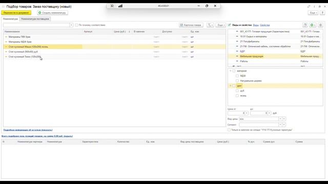 Подбор товаров в документы закупки в 1C:ERP
