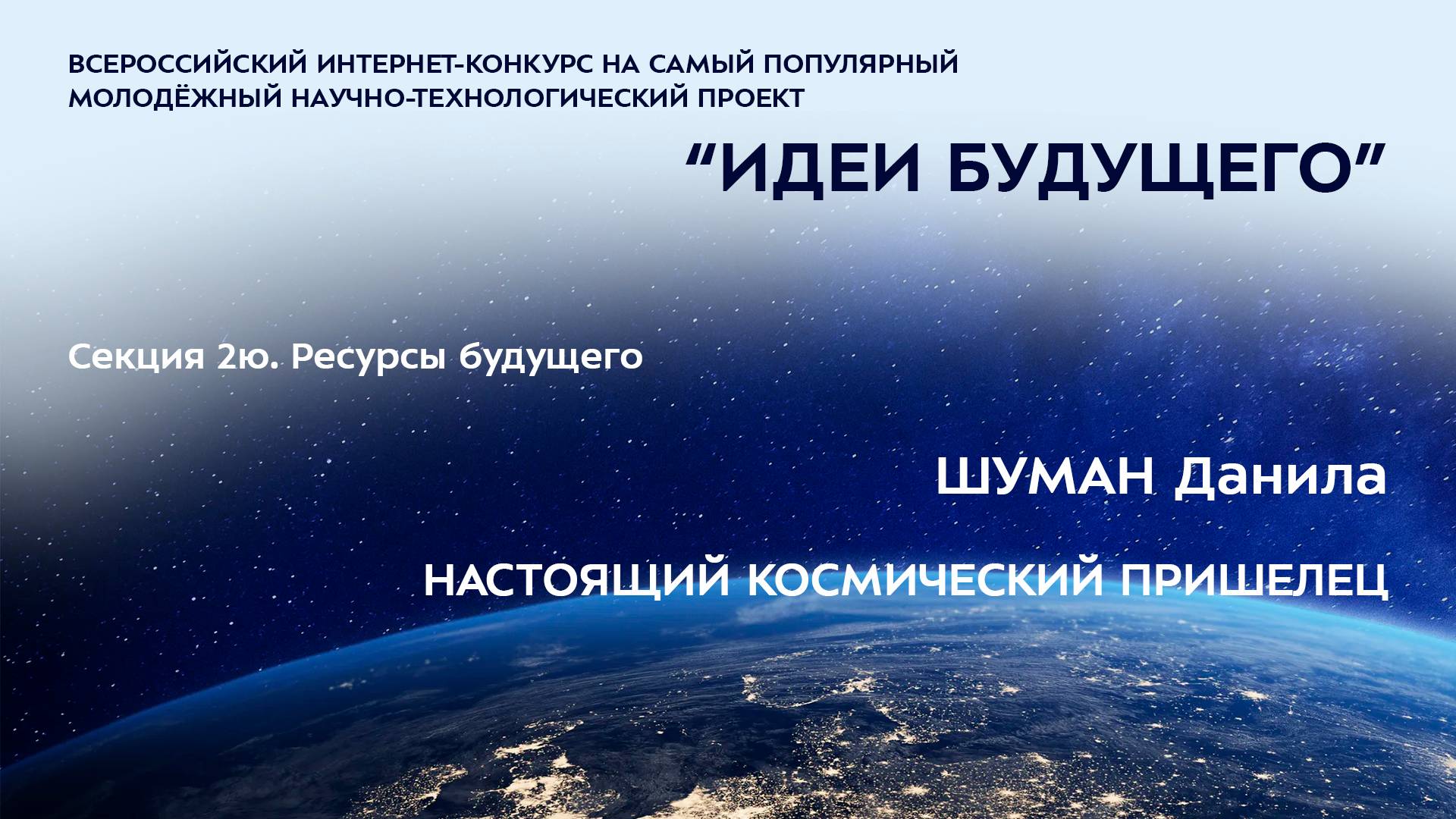 (2Ю-20) ШУМАН Данила Родионович Самарская область, г. Самара ЧОУ Лицей №1 «Спутник», 3 класс НАСТОЯЩИЙ КОСМИЧЕСКИЙ ПРИШЕЛЕЦ Научный руководитель: Гамина Светлана Николаевна, Самарская область, г. Самара, ЧОУ Лицей №1 «Спутник», учитель начальных классов, заместитель директора по НМР Более подробно о мероприятиях Программы "Шаг в будущее" можно узнать на сайтах http://www.step-into-the-future.ru/ и http://шагвбудущее.рф