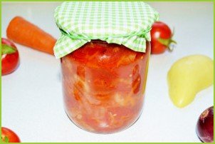 Болгарский перец 150 гр Помидоры 200 гр Морковь 100 гр Лук репчатый 100 гр Растительное масло 90 мл Соль 4 гр Сахар 25 гр Лавровый лист1 шт. Чеснок 1 зубч. Горчица 10 гр Уксус 20мл