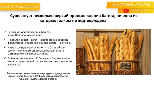 Консультации: https://t.me/denismashkovv или +7 999 962 28 06 ✅Открыть предприятие: https://technologybp.ru Купить ткань для расстойки теста в розницу: https://vk.cc/csMIiV ТГ Канал КАК ОТКРЫТЬ ПЕКАРНЮ: https://t.me/open_bakery ИСТОРИЯ БАГЕТА. Как открыть пекарню. Денис Машков. 00:00 История французского багета • Видео рассматривает историю французского багета, длинного и тонкого хлебобулочного изделия с мягкой внутренней частью и хрустящей корочкой. • Багет является символом Франции, но также получил распространение по всему миру. 00:54 Происхождение багета • Существует несколько версий происхождения багета, но ни одна из них не была подтверждена. • По одной из версий, багет был создан специально для французской армии в эпоху наполеоновских войн. • По другой версии, багет был изобретен в Вене в 1839 году. 02:46 Традиции и виды багета • Багет принято ломать, а не резать, и он быстро черствеет. • Во Франции можно купить несколько видов тонкого хлеба, включая традиционный багет, багет по-деревенски, багет по особому рецепту пекаря и багет в форме колоса. • Багет используется для приготовления сэндвичей и других блюд.