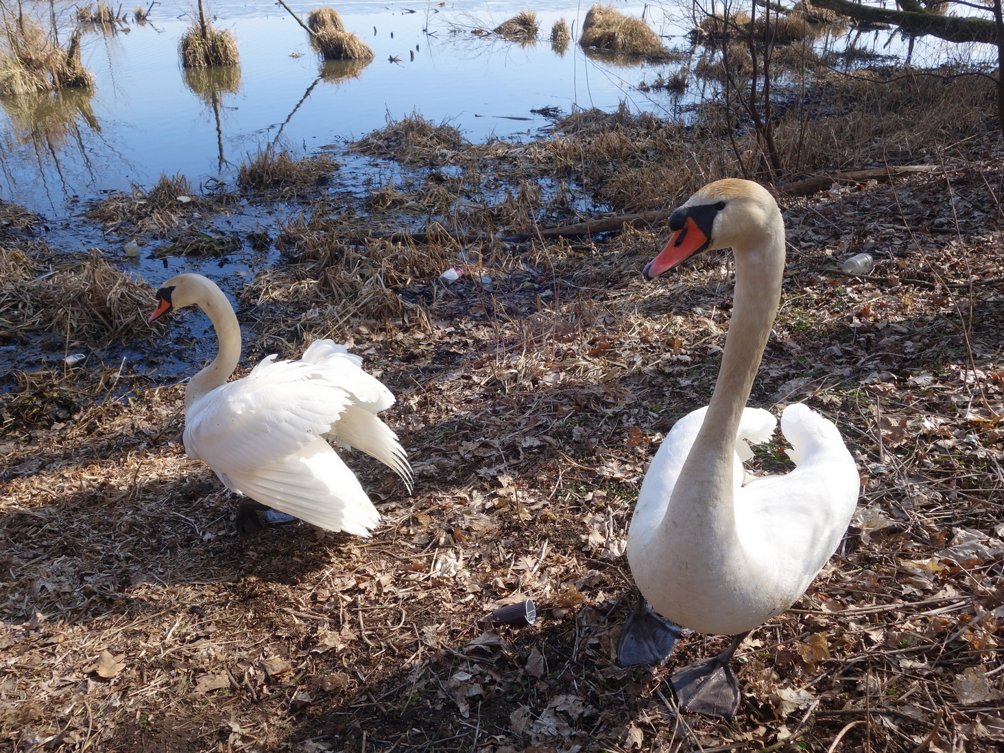 Лебеди на берегу пруда. Гурьевск (Калининградская область). Март 2018 года.