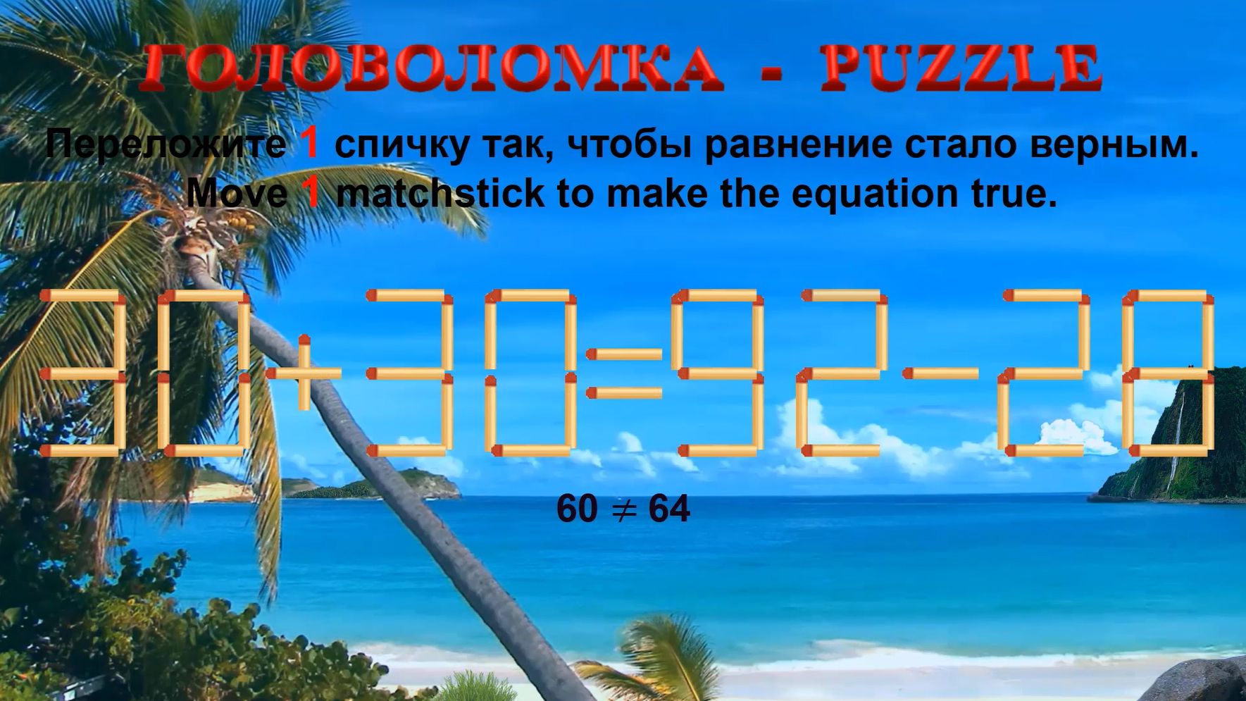 ГОЛОВОЛОМКА – PUZZLE. Спичка. 30+30≠92-28, 52+32≠25+56, 69+23≠58+32, 93+30≠98+23