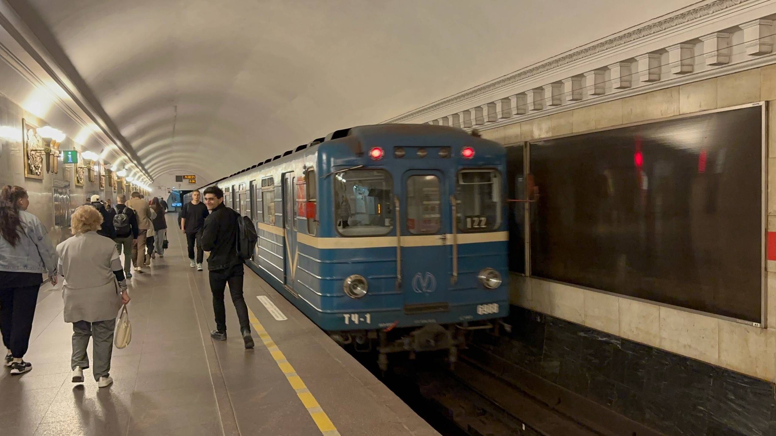 "Смешной пассажир!" Метропоезд Ем-501/Ема-502 №122 на ст.м.Владимирская, июнь 2025 года