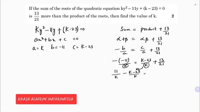 If the sum of the roots of the quadratic equation ky^2-11y+(k-23)=0 is 13/21 more than the product