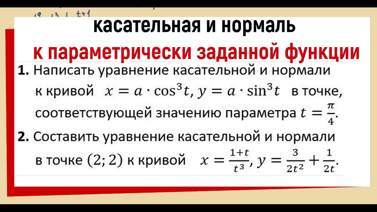 Как составить уравнение касательной к кривой, заданной параметрически в указанной точке ? Как составить уравнение касательной и нормали к кривой в точке, соответствующей значению параметра t ? Как составить уравнение касательной к параметрической функции ? Решим примеры: Пример 1. Написать уравнение касательной и нормали к кривой, заданной параметрическими уравнениями x=a*(cost)^3, y=a*(sint)^3, в точке, соответствующей значению параметра t=π/4. Пример 2. Составить уравнение касательной и нормали в точке (2;2) к кривой x=(1+t)/t^3 , y=3/(2*t^2)+1/2t Здесь это используется: Что такое параметрически заданная функция, производная параметрически заданной функции https://youtu.be/35YqNcRQmcg Геометрический смысл производной. Уравнение касательной и нормали. https://youtu.be/KLzq2TTZN34 Все видео по теме ПРОИЗВОДНАЯ и ДИФФЕРЕНЦИАЛ здесь: https://www.youtube.com/playlist?list=PLGtfmJuN1mTA_vI3eLT8jMTEeJ0YDIh-z Загляни на канал! Там ещё много полезного, ОБЯЗАТЕЛЬНО ПРИГОДИТСЯ !!! Спасибо за просмотр! . . .