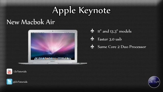 The Apple Keynote is on tomorrow and we have a nice idea of what will be announced. First off it's pretty obvious from the keynote invitation that Apple sent out, that we are going to see a brand new Operating System. Will this new OS include touch capabilities? I think so... Just like iOS was announced last time around, Snow Leopard is dew for a revamp. This revamp will be called OS 10.7 - Lion ! Although they will announce OS Lion tomorrow, I don't think it will be the official launch of the Operating System. Apple like to do this to us. Keep us waiting! I would give it 4-5 months... Next up we have the Macbook Air. This is the one thing that I am pretty certain of. I will be shocked if they do not release a New Macbook Air. In my opinion the currant macbook air is too pricey for what you get. If they add in some cool new features, it could catch on among Apple fans. They might also revamp the Macbook Pro line with some new processors to give it a little bit more power. ★ Subscribe: http://bit.ly/Subscribe_ZeTutorials {Thanks to everyone who subscribed.} ★Twitter: http://twitter.com/ZeTutorials Let me know what you think will be announced in the comments :)