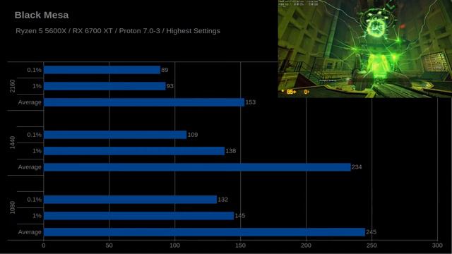 Black Mesa gameplay benchmark. Running in GNU / Linux Kubuntu 22.04 LTS. Using Steam Proton 7.0-3, highest settings. The game also has a native linux version, but in my experience there are many graphic glitches that do not show up in the proton version. Specs: CPU Ryzen 5 5600X GPU Radeon RX 6700XT RAM 32 GB 3200 mhz