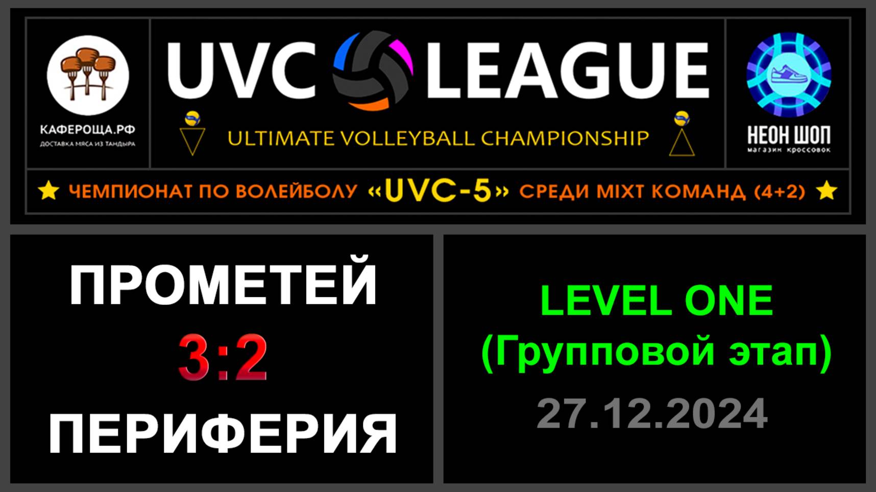 UVC-5 (Mixt): Чемпионат UVC Лиги по волейболу среди MIXT команд (4+2), 2024-2025 гг. Результаты игры: LEVEL ONE (Групповой этап) 27.12.2024 Прометей - Периферия 3:2 (24:26, 19:25, 25:11, 25:14, 15:4) Конкурс «РЕШАЛА»: ⛔Прометей допустил 4 ошибки в финальном этапе и завершил своё участие в конкурсе! Конкурс «Робин Гуд»: ⛔Точных попаданий не было! #UVC_ЛИГА_ЧЕМПИОНАТ_UVC_5_Mixt