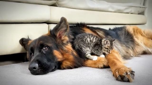 Немецкая овчарка встречает маленького котёнка - 2025 год