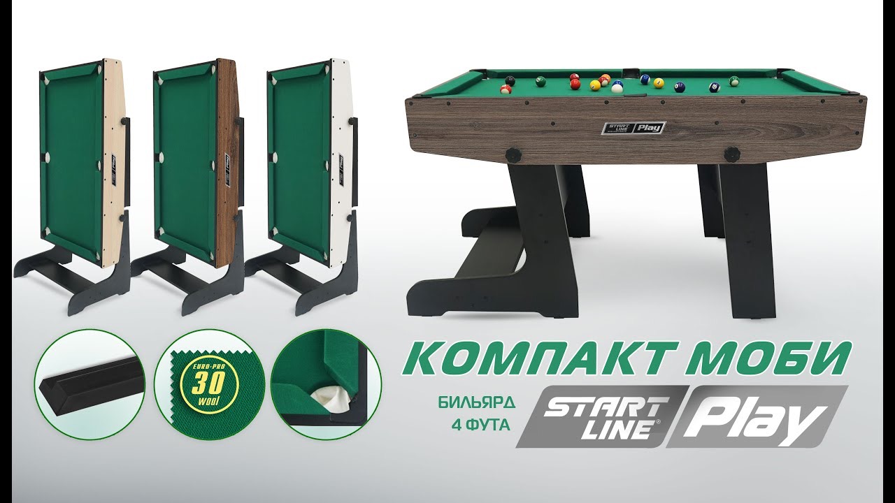 Бильярдный стол «Компакт Моби» для пула — отличная альтернатива полноразмерному бильярдному столу для домашних игр в пул с семьёй и друзьями. Играть могут и взрослые, и дети, а за счёт лаконичного дизайна модель отлично впишется в любой интерьер. Особенностью стола является его миниатюрный и компактный размер. В разложенном виде он имеет габариты 770 мм в ширину, 1372 мм в длину, высота до игровой поверхности 730 мм. «Компакт Моби» не займет много пространства даже в небольшой квартире, его хранение не доставит неудобств. В собранном виде стол имеет габариты 770 мм в ширину, 590 мм в глубину и 1640 мм в высоту. Еще одним преимуществом данной модели является удобный механизм складывания, позволяющий без особых усилий быстро сложить или разложить бильярдный стол. Благодаря складной конструкции опорных ножек, бильярдный стол при хранении занимает минимум пространства. Компактные размеры делают транспортировку и перемещение стола очень удобным. Корпус игрового стола выполнен из прочной ЛДСП толщиной 16мм и легко выдерживает нагрузки при активной игре. Профессиональная бортовая резина стола «Компакт Моби» отличается правильной формой и плотностью, что обеспечивает стабильный отскок шара от борта. Лузы имеют строгие параметры, они выполнены по стандарту и задают правильную игру. Сетка позволяет легко извлекать забитые шары. Игровое поле и борта стола покрыты профессиональным износостойким сукном Euro PRO 30 Yellow Green, обеспечивающим необходимое сочетание скорости, скольжения и точной траектории шара. Стол «Компакт Моби» представлен в 4 вариантах выкраски: Стандарт, Анкор, Аризона, Йоркшир. Широкая палитра цветов позволит подобрать подходящий стол для своего интерьера. В комплекте с бильярдным столом «Компакт Моби» идет набор аксессуаров Start Billiards, который содержит самые необходимые инструменты для игры в пул. Данный набор включает в себя два раминовых двусоставных кия, шары для пула диаметром 38 мм, пластиковый треугольник, мост для дополнительной опоры кия во время удара, а также мел и разметку. Приобрести ассортимент представленного бильярдного оборудования можно на сайте https://www.fabrika-start.ru/ Получить консультацию по товарам и актуальным акциям можно по телефону бесплатной линии 8 800 505 44 90