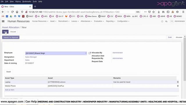 Odoo Demo - Employee Asset Management | Apagen Solutions Pvt. Ltd. (Odoo Service Provider)