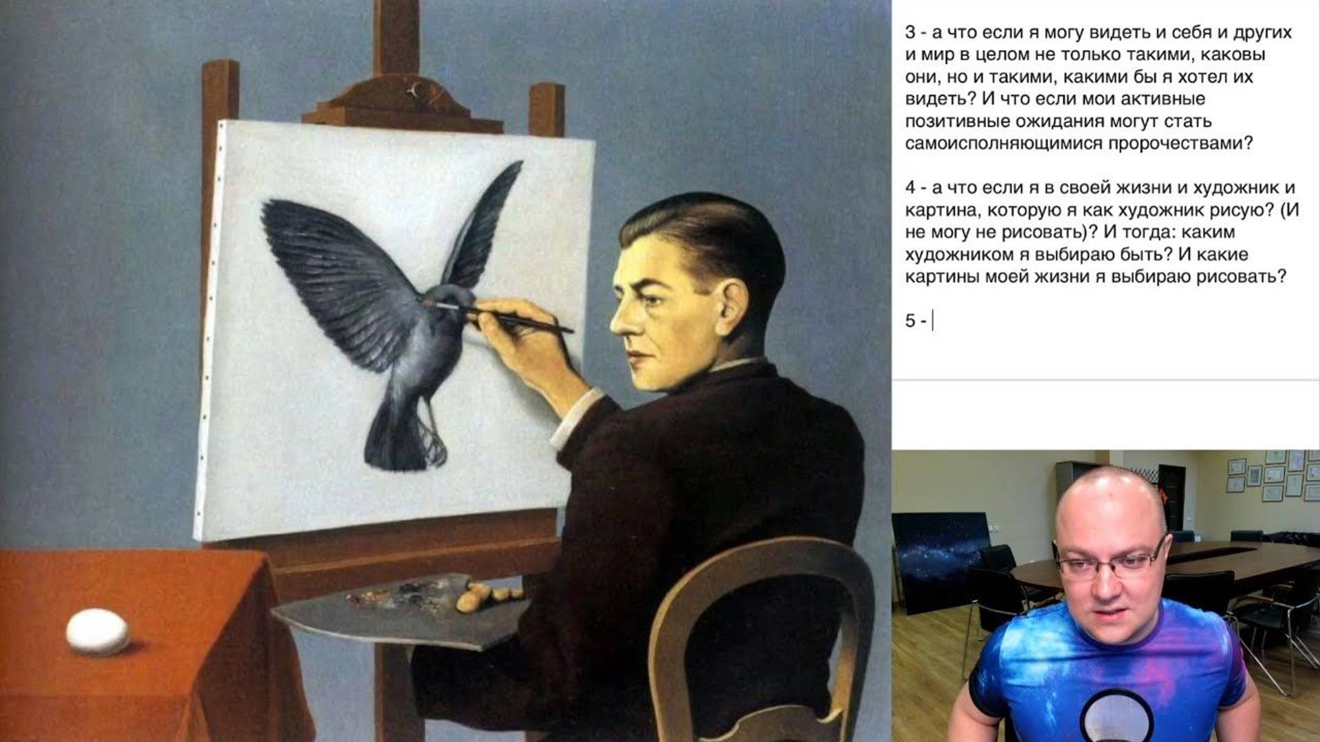 1 - два формата восприятия: через утверждение / через вопрос. Здесь все понятно / Чему я могу здесь научиться? 2 - человек — это не только то, что и кто он есть сейчас, но это и то, каким он может быть. О чем это для меня? 3 - а что если я могу видеть и себя и других и мир в целом не только такими, каковы они, но и такими, какими бы я хотел их видеть? И что если мои активные позитивные ожидания могут стать самоисполняющимися пророчествами? 4 - а что если я в своей жизни и художник и картина, которую я как художник рисую? (И не могу не рисовать)? И тогда: каким художником я выбираю быть? И какие картины моей жизни я выбираю рисовать? 5 - дисциплину никто не отменял. И даже для рисования требуются усилия и усидчивость. Или нет?