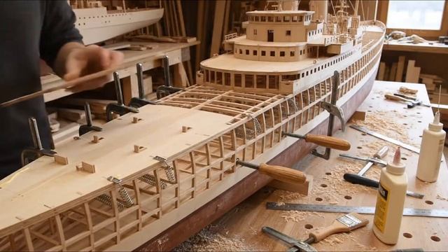 Внутри деревянной модели линкора USS Arizona, собранной с нуля.