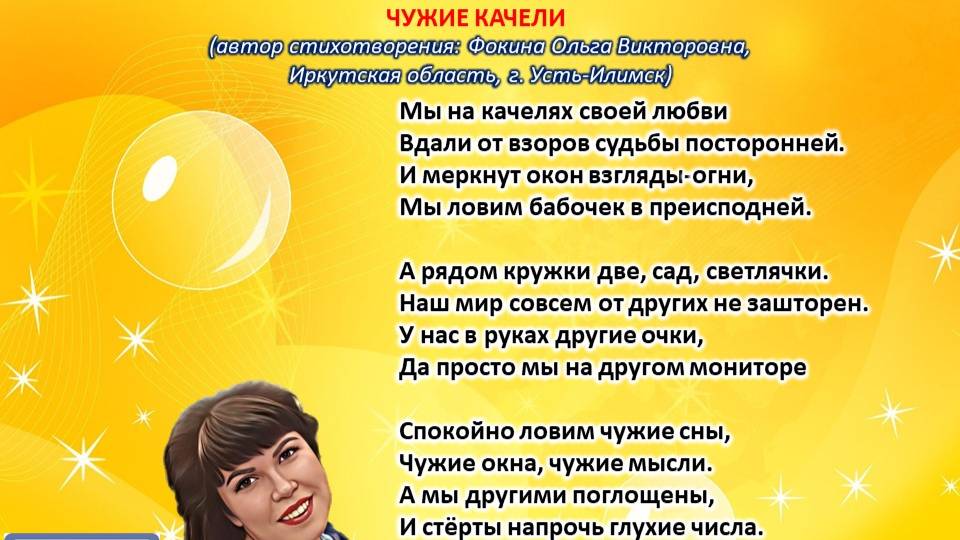 Читает автор стихотворения: ФОКИНА ОЛЬГА ВИКТОРОВНА (Иркутская область, город Усть-Илимск) СТИХИ: https://stihi.ru/2018/07/08/3790 БИОГРАФИЯ: http://www.proza.ru/2019/10/08/1473 ВЫИГРЫВАЙТЕ КНИГИ БЕСПЛАТНО: https://proza.ru/2017/09/17/447 ОТЗЫВЫ ЧИТАТЕЛЕЙ: http://www.proza.ru/2019/11/29/611 Из книги Фокиной Ольги Викторовны (Усть-Илимск) «Несу добро в ладошках!»: [все стихотворения с 2005 по октябрь 2020 гг., проза, авторские песни, интервью]. – Москва: МГО Союза писателей России, 2020 г. – 886 стр., ил. ISBN 978-5-7949-0826-8 ЧУЖИЕ КАЧЕЛИ (автор стихотворения: Фокина Ольга Викторовна, Иркутская область, г. Усть-Илимск) Мы на качелях своей любви Вдали от взоров судьбы посторонней. И меркнут окон взгляды-огни, Мы ловим бабочек в преисподней. А рядом кружки две, сад, светлячки. Наш мир совсем от других не зашторен. У нас в руках другие очки, Да просто мы на другом мониторе Спокойно ловим чужие сны, Чужие окна, чужие мысли. А мы другими поглощены, И стёрты напрочь глухие числа. И мы летим над палитрой домов, Чтоб выше солнца, касаясь неба... Летим мы слепо в иллюзии снов И покидаем мир чёрно-серый... 9 июля 2017 г. Стихотворение зарегистрировано на авторские права, поэтому его цитирование возможно только с указанием полного авторства: Фокина Ольга Викторовна (г. Усть-Илимск)