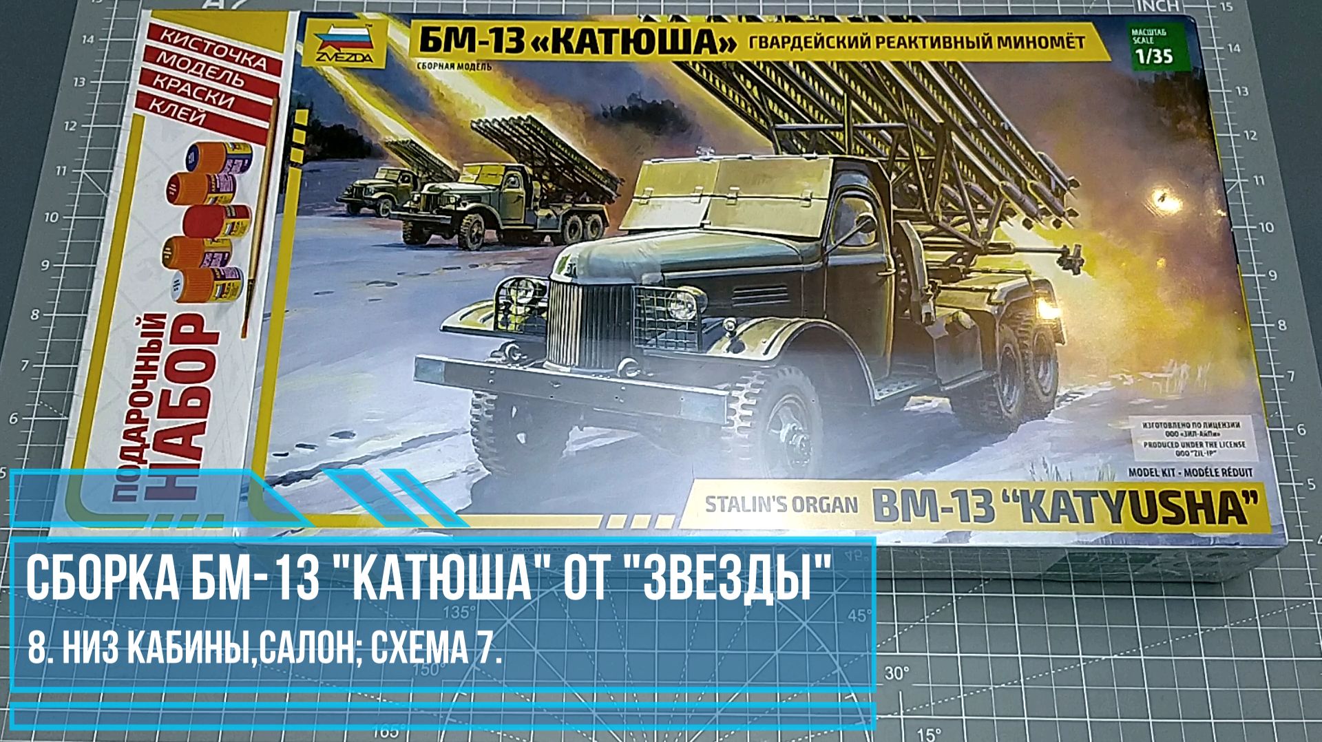 8. Сборка Гвардейского реактивного миномета БМ-13 "Катюша" от "Звезды". Собираю, окрашиваю и прикрепляю основание кабины к шасси. Собираю салон. Схема 7. - https://rutube.ru/video/00accb5a61844ef778eab03324b37e37/ - Гвардейский реактивный миномет БМ-13 "Катюша" на базе автомобиля ЗИС. г. Нижний Новгород. Фотоальбом. - https://rutube.ru/video/e6436a80d1fea6cd9bbc16b7c873ae1e/ - Гвардейский реактивный миномет БМ-13 "Катюша" на базе автомобиля ЗИС. г. Анапа. Фотоальбом. 1. https://rutube.ru/video/ca9450ace93ea9f600ecdc8c04fab0fd/ - распаковка и осмотр содержимого коробки. 2. https://rutube.ru/video/f431709e18e2c4646bee57b06594c89d/ - рама, схема 1. 3. https://rutube.ru/video/d2e4934205fe2d4c4aee35e8e750862c/ - мосты, схемы 2,3. 4. https://rutube.ru/video/2ce9aef43459f2779bc0bb8738a999bb/ - ходовая, схемы 4,5,7. 5. https://rutube.ru/video/eb6f92ef2de89f8a036c483ded52e577/ - стойки (домкраты), задний габарит, схема 8. 6. https://rutube.ru/video/58c2e50346ce7eb2c5ba989de70a98f9/ - окраска шасси, габарита. 7. https://rutube.ru/video/65233d7182ab373f79703401c9ff6312/ - колеса схемы 4,6.