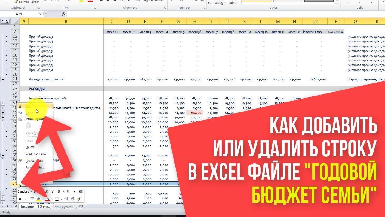 Как добавить или удалить строчку в Excel файле "Годовой Бюджет Семьи"
