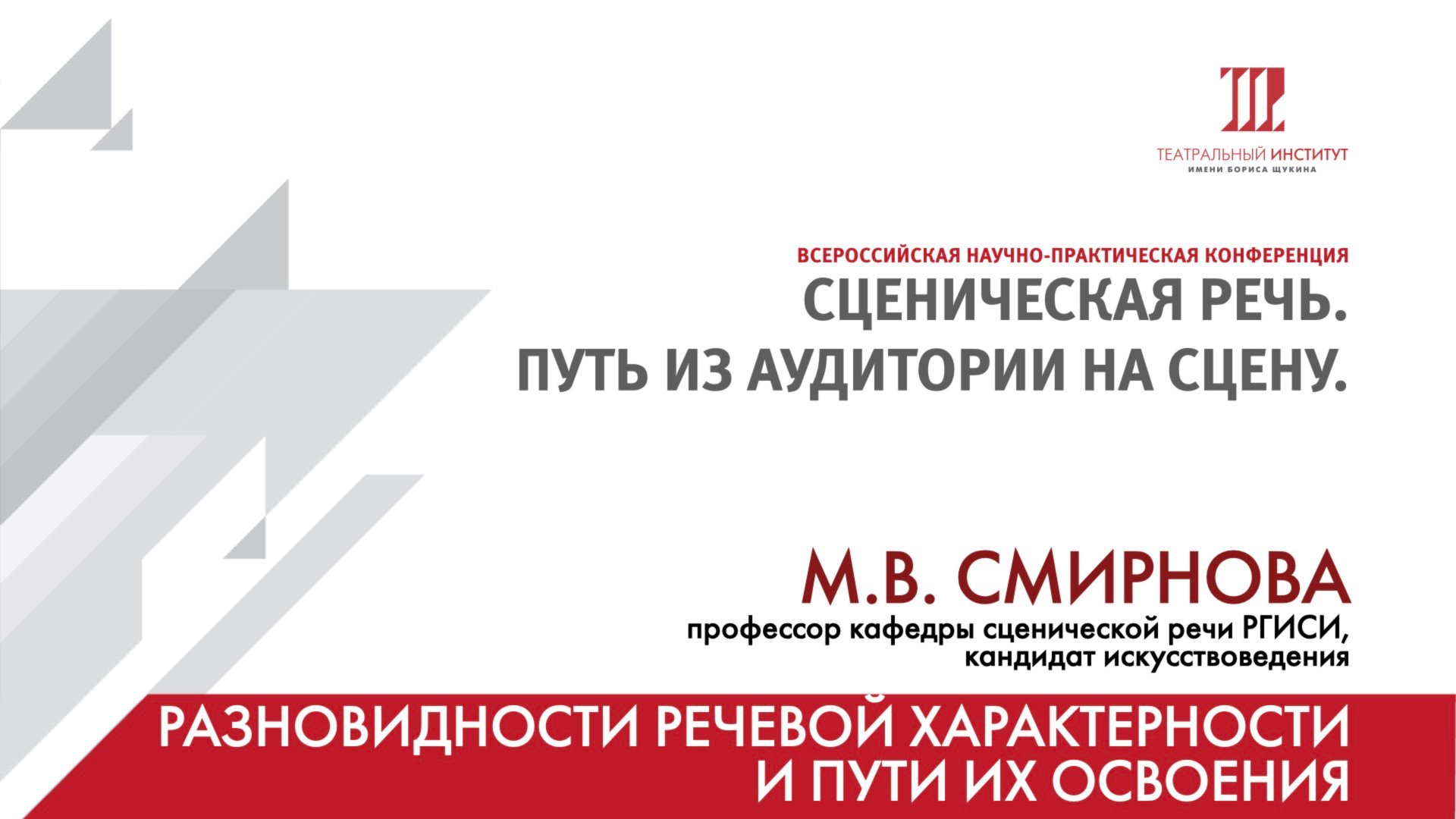 Общероссийская научно-практическая конференция «Сценическая речь: путь из аудитории на сцену» Организаторы: Кафедра сценической речи ГИТИС, Кафедра сценической речи Театрального института имени Бориса Щукина 21 ноября 2024 г. Тема дня: «Живое слово и театральная педагогика» Техника речи. Из опыта 2023-2024 учебного года. Модератор – Анна Марковна Бруссер Сообщение «Разновидности речевой характерности и пути их освоения» – М.В. Смирнова, профессор кафедры сценической речи РГИСИ, кандидат искусствоведения Театральный институт им. Бориса Щукина при Государственном академическом театре им. Евгения Вахтангова. Основное здание Театрального института. 119002, Россия, г. Москва, Большой Николопесковский пер., д. 12 А, стр.1. Фото Елены Бекиш. Видео Вячеслав Новиков. Архив Учебного театра. © Театральный институт имени Бориса Щукина. 2024 г.