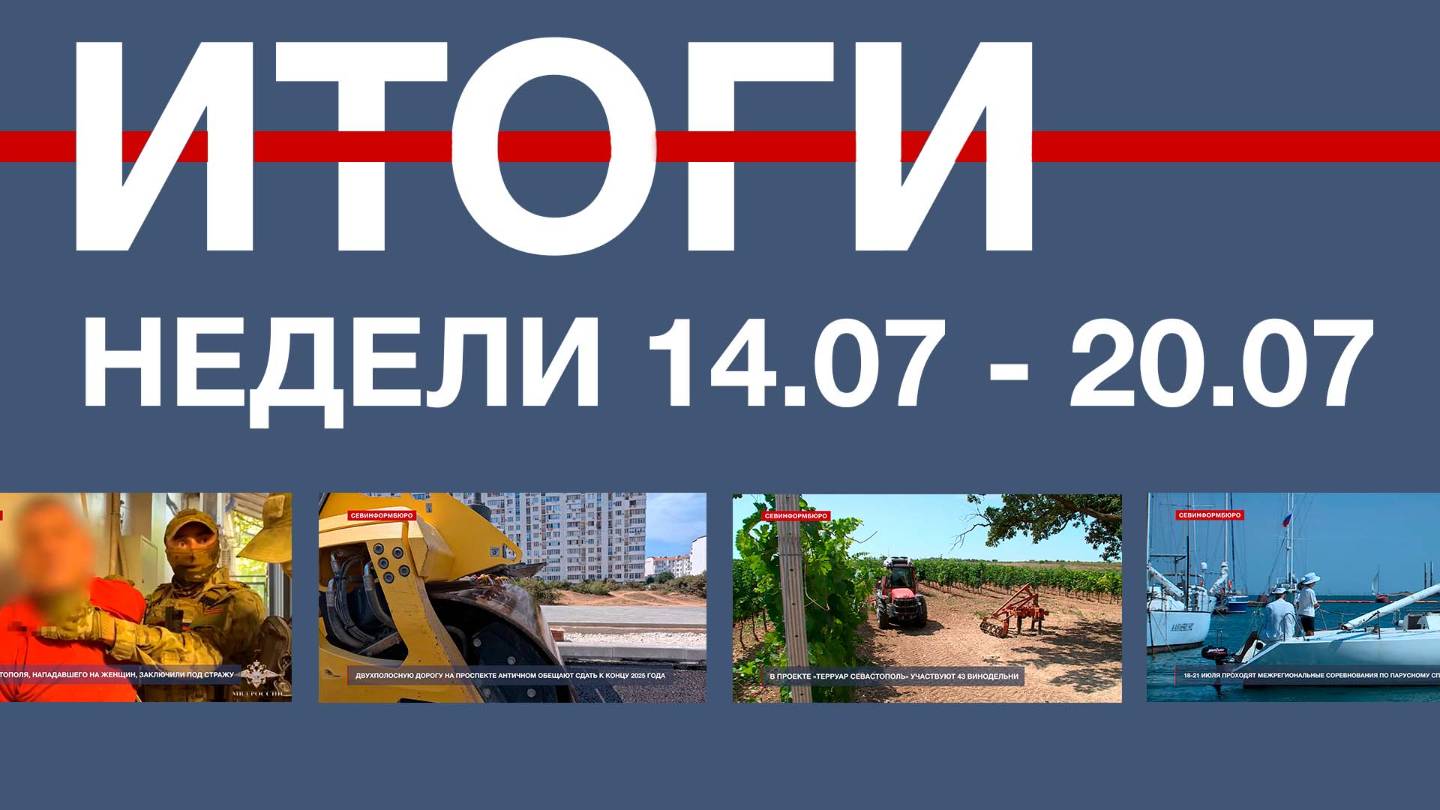 Основные события недели в Севастополе: - Жителя Севастополя, нападавшего на женщин, заключили под стражу; - Волонтёры «Зова сердца» отправили продовольствие и медикаменты для бойцов СВО; - Двухполосную дорогу на проспекте Античном обещают сдать к концу 2025 года; - 100 дорог и 1 мост отремонтируют за год по нацпроекту в Севастополе; - Севастопольский Автодор проводит механизированный покос сухой травы; - На территории Мекензиевского лесничества проверили соблюдение противопожарных мер; - На набережной села Андреевка появятся гамаки и новая спортивная площадка; - В «Уютстрое» чиновники проверили цены на социально значимые товары; - В проекте «Терруар Севастополь» участвуют 43 винодельни; - В сельхозпредприятии «Качинский+» благодаря субсидиям появился питомник для винограда; - Росреестр организовал квест для будущих геодезистов и кадастровых инженеров; - На Федюхиных высотах реализуют проект «Севастополь. Русская Троя; - На пляжах Севастополя стартовала акция «Научись плавать»; - В Севастополе стартовал Кубок Адмирала по водному поло среди юношей до 16 лет; - В севастопольской регате «Помним» участвуют 20 яхт. Подписывайтесь на наш Телеграм-канал: https://t.me/nts_novosti Смотрите новости Севастополя и Крыма на сайте НТС: http://nts-tv.com В нашей группе "ВКонтакте": https://vk.com/ntssevastopol На странице в "Одноклассниках": https://ok.ru/ntssevastopol
