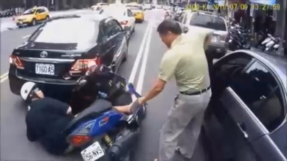 Водитель автомобиля решил помочь подняться скутеристу, который упал по его вине.