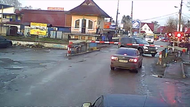 На регистраторе не настроено время. Действие происходило в Боярке, Киевской обл. 29 12 2017. в 08.30. Водитель " Мерседеса" встал на ж/д переезде и едва не попал под поезд, был спасён рабочим ,который вручную поднял шлагбаум и дал тому выехать из опасной зоны.