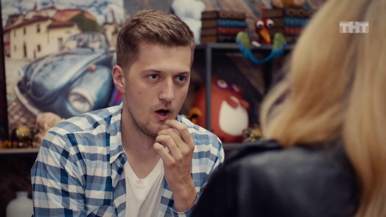 Виталик умело флиртует с клиенткой, которая пришла к ним в магазинчик за кубик Рубика и шахматами.
