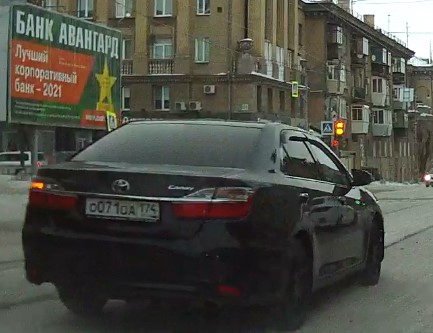 Пересечение стоп-линии и выезд на перекрёсток на запрещающий движение сигнал светофора. Госномер нарушителя О071ОА 174 Toyota Camry 2016 г.в., чёрный металлик. Перекрёсток ул. Ленинградской и ул. Ленина. 20-01-2022 п. 6.16 ПДД Дорожный знак "Стоп-линия". Место остановки транспортных средств при запрещающем сигнале светофора. п. 6.2. ПДД - жёлтый сигнал запрещает движение, красный сигнал запрещает движение, зелёный сигнал разрешает движение. п. 6.13 ПДД - при запрещающем сигнале светофора... водители должны остановиться перед стоп-линией (знаком 6.16).