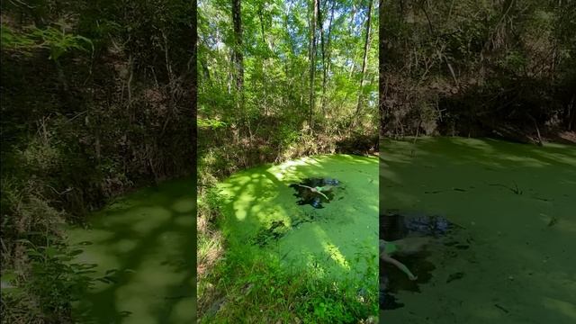 Женщина ныряет в водоем с ряской и купается в ней.