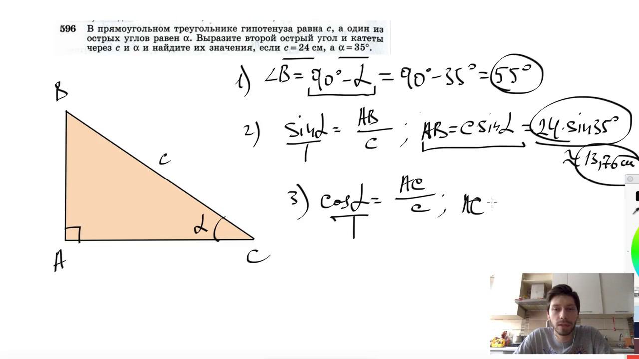 №596. В прямоугольном треугольнике гипотенуза равна с, а один из острых углов равен α. Выразите второй острый угол и катеты через с и α и найдите их значения, если с=24 см, а α=35°. Поддержать канал рублём - 5469400944002125 (Сбербанк) Мой второй канал для подготовки к ЕГЭ и ОГЭ - https://www.youtube.com/ЕвгенийСумин Инстаграм - https://www.instagram.com/EGE_OGE.math Личный инстаграм - https://www.instagram.com/ee_sumin VK - https://vk.com/evgeniysumin FB - https://www.facebook.com/EvgeniySumin